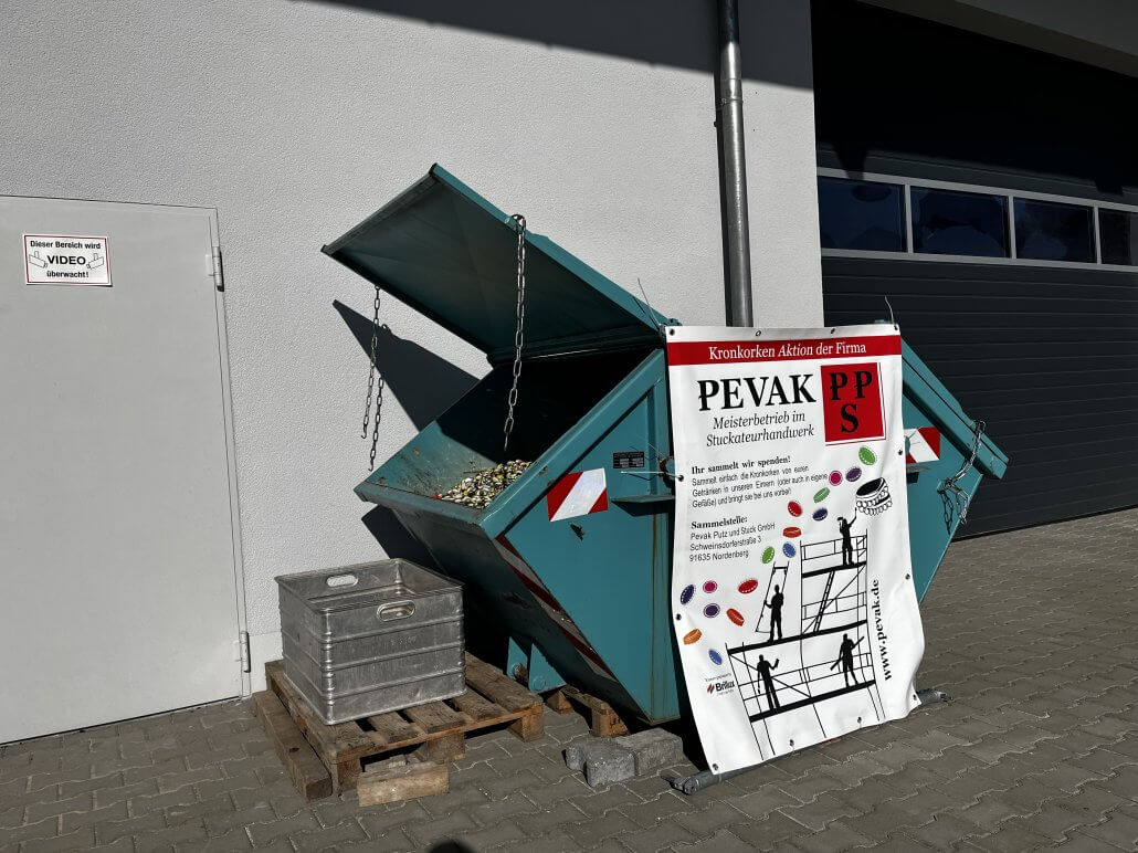 Ihr bringt uns den Eimer voll mit Kronkorken zurück. Wir geben den Wert als Spende weiter. Danke!